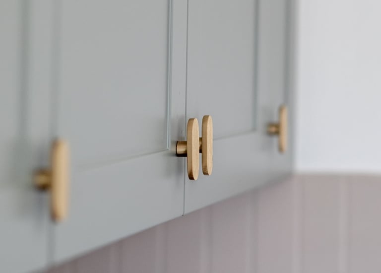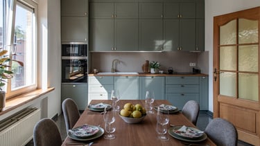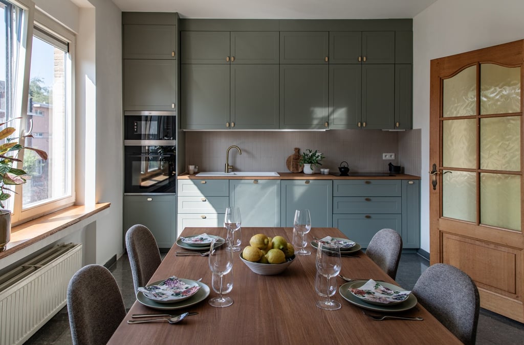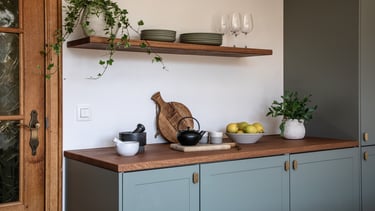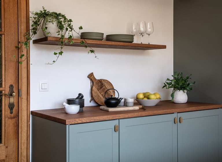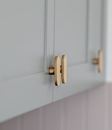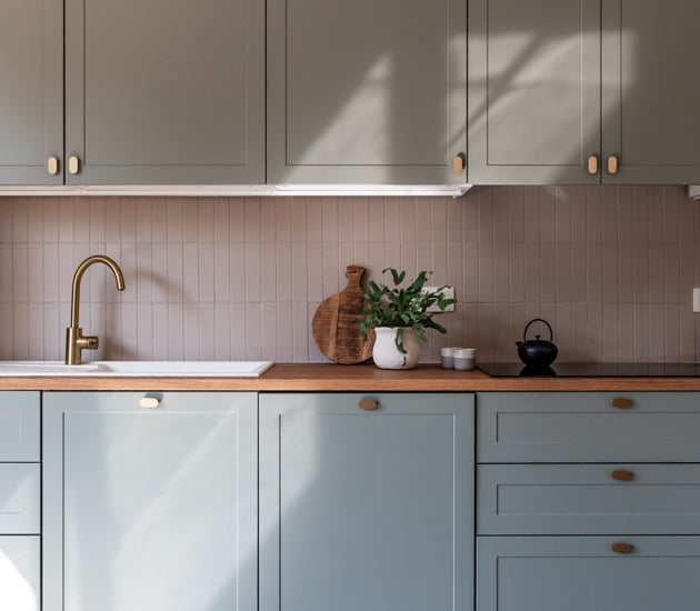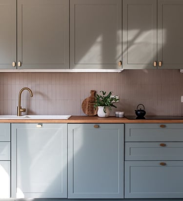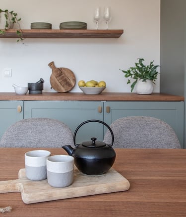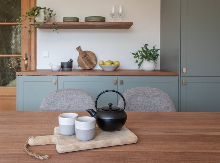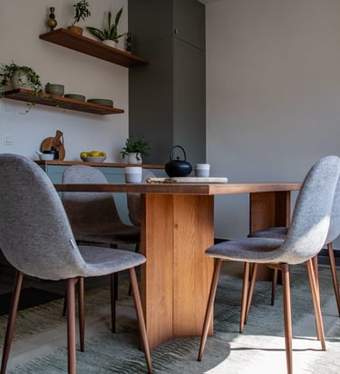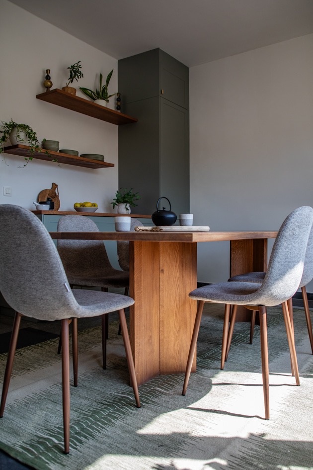 Conception et réalisation d’une cuisine sur mesure aux façades à cadre couleur stone, dans un style cottage moderne, avec poignées et robinet en laiton, évier en résine blanche et crédence en zellige couleur pastel. Pour sublimer l’ensemble, nous avons imaginé et fabriqué une table en chêne au design unique, pensée pour s’harmoniser parfaitement avec la cuisine et créer un espace à la fois chaleureux et élégant.