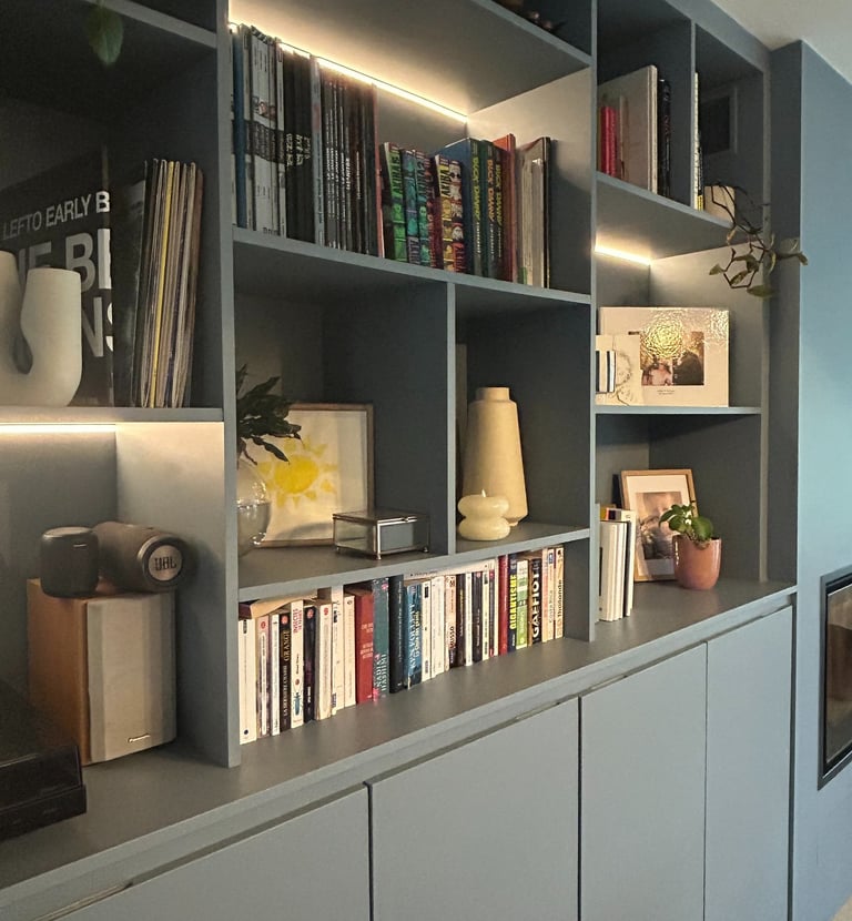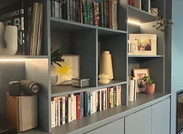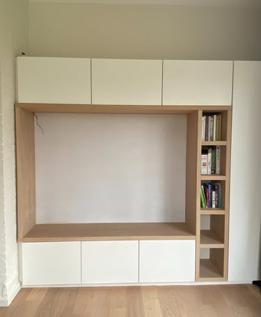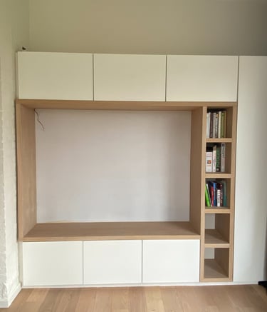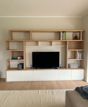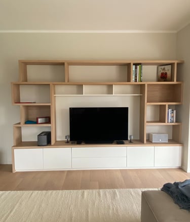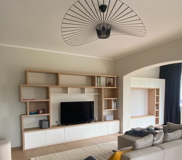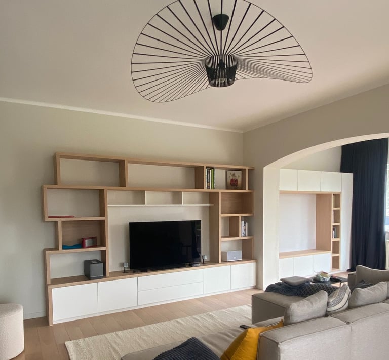 Un meuble de salon sur mesure, pensé pour réunir en harmonie espace TV, bibliothèque et coin lecture cosy avec banquette. Conçu et fabriqué par nos soins pour allier design, confort et fonctionnalité.
