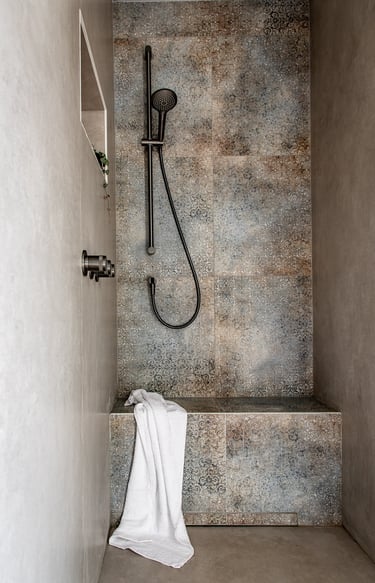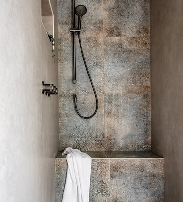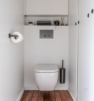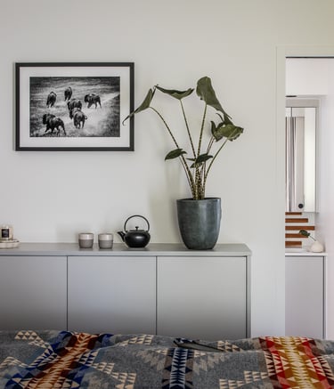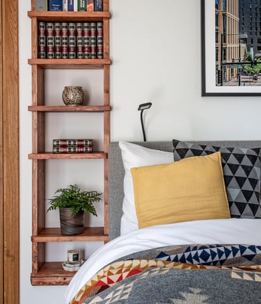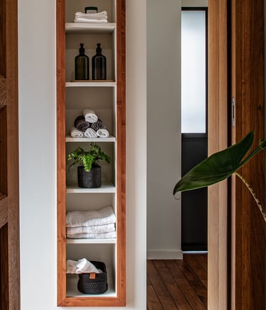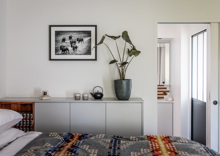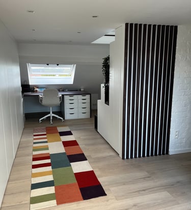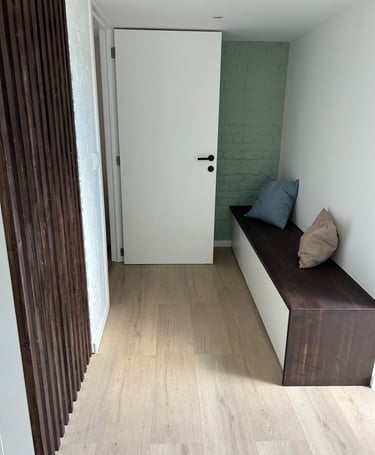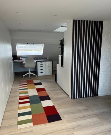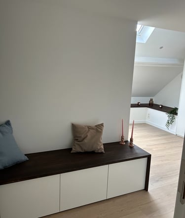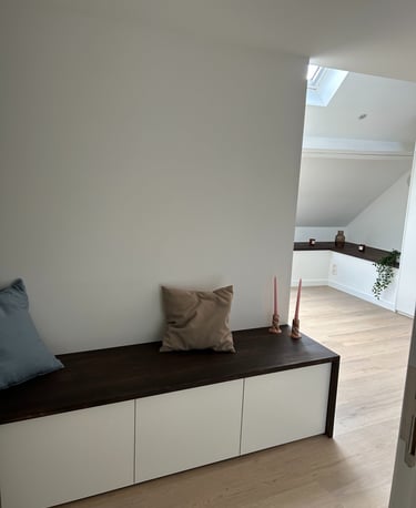 Sous les toits, nous avons entièrement repensé la circulation des combles pour révéler leur plein potentiel. Chaque zone a trouvé sa place : un hall d’entrée accueillant qui donne le ton, un espace nuit douillet, un dressing élégant, un bureau inspirant, et, perché en hauteur, une mezzanine transformée en coin salon cosy, invitant à la détente. En plus de la rénovation, nous avons conçu et fabriqué 100 % du mobilier : une banquette sur mesure, un dressing parfaitement intégré, une banquette-coffre côté lit offrant assise et rangements, un escalier à pas japonais menant à la mezzanine, ainsi que des étagères suspendues et un claustra apportant rythme et légèreté à l’espace.